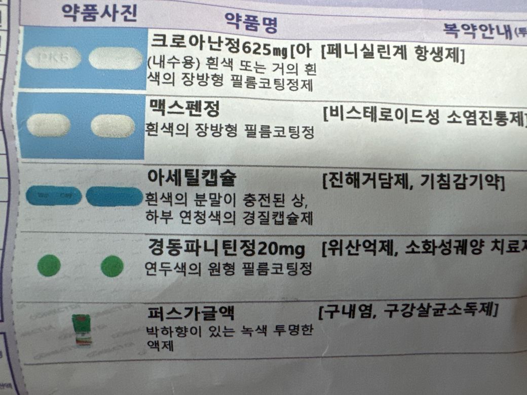 크로아난정, 맥스펜정, 아세틸캡슐, 경동파니틴정 처방 받았습니다