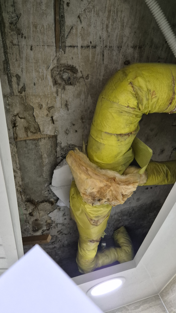 배관을 감싸고 있는 보온섬유가 누수로 인해 부풀어져 있고 조금씩 물이 새고 있었습니다.