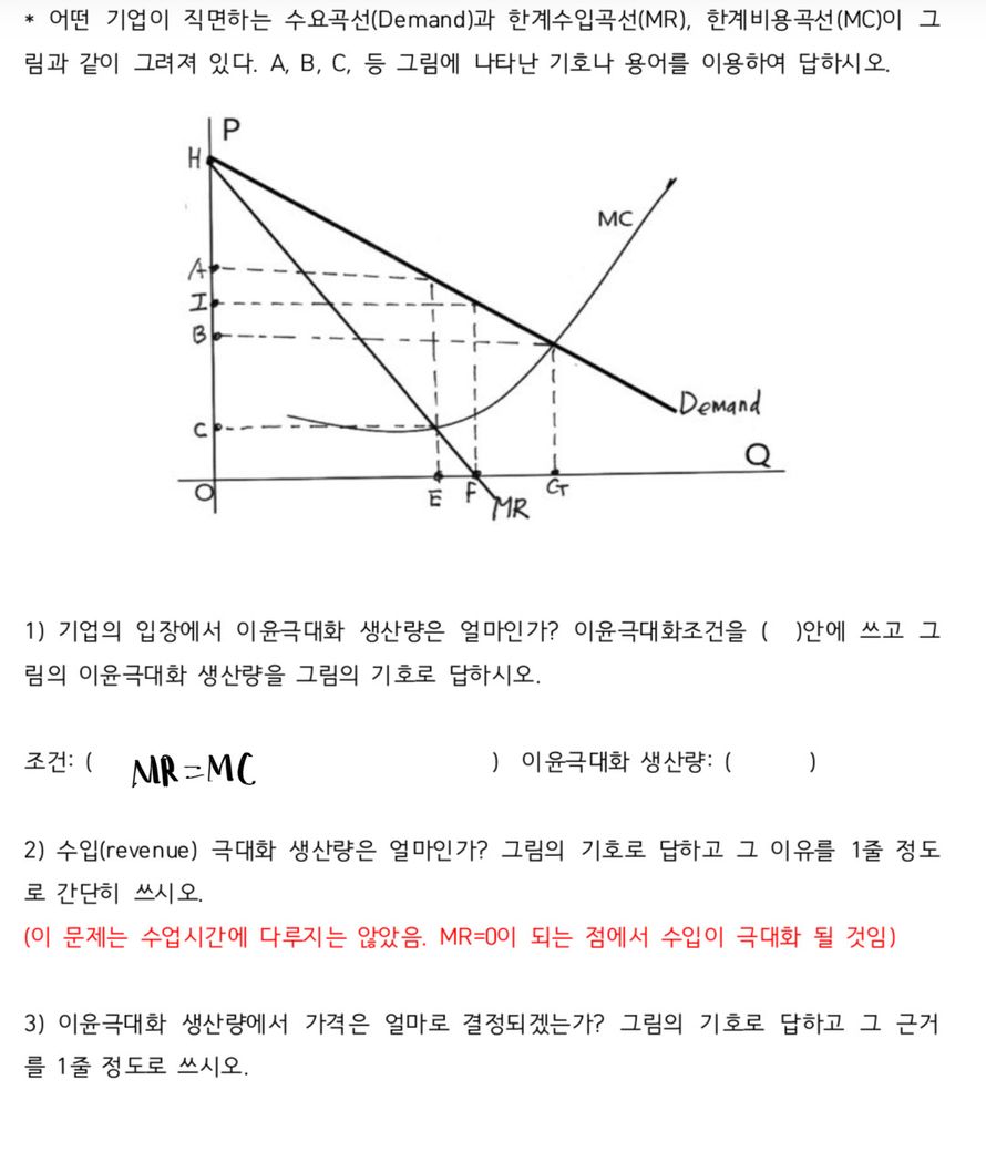1번에 이윤극대화 생산량 지점이 MR과 MC가 접하는 점인데 그러면은 그래프에서 접하는 점의 x축인 E가 답인가요??정확한 답을 알고싶어요