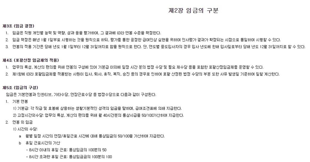 회사 그룹웨어 내 확인되는 급여지급규정에는 아래와 같이 확인되는데 (이 부분이 사측에서 말하는 21년 개정한 취업규칙인듯합니다), 해당 내용에 근거하여 사측이 말하는 내용이 맞는지 확인 부탁드립니다.