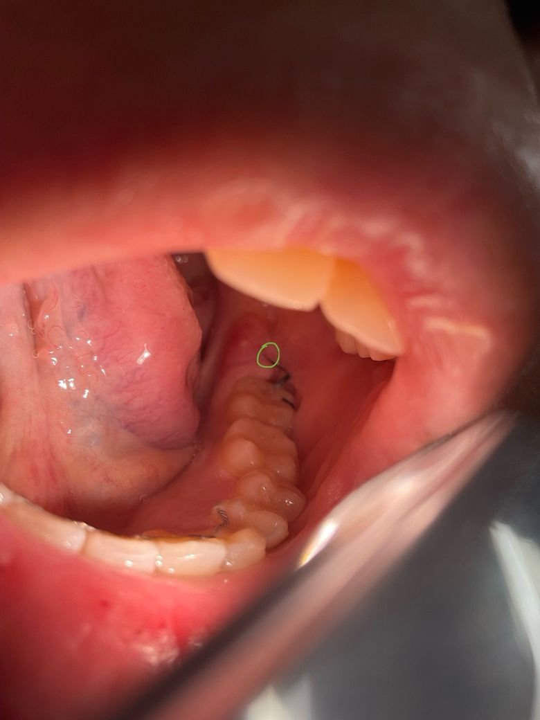 실밥 매듭이 두 갈래로 나뉘어져 있는데요 한 갈래는 정상인데 나머지 한 갈래는 발치 후 생성되는 육아조직? 안쪽으로 들어간듯 합니다