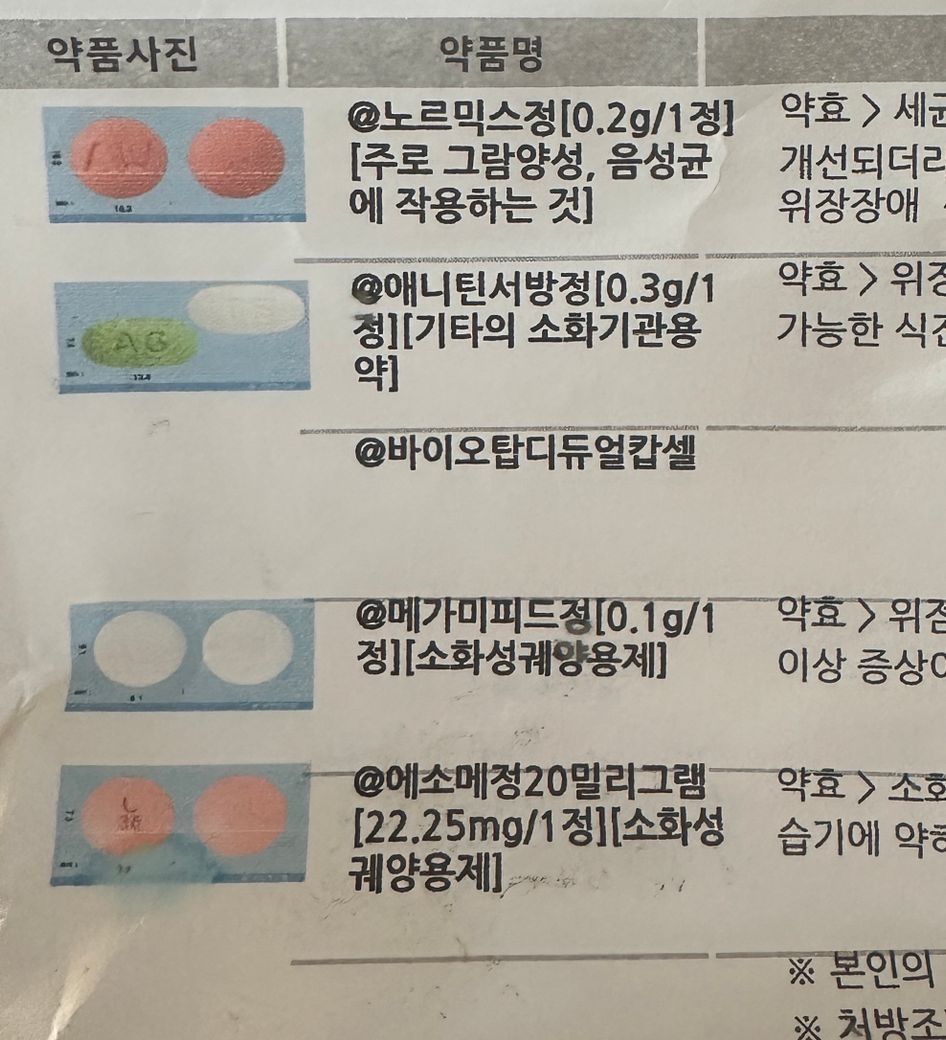 반면 아래의 약은 노르믹스라는 항생제가 처방이 났는데, 이는 장내 세균총 이상에 의한 장염 증상을 개선시키기 위해 처방이 나는 약입니다. 여기에 위장보호제, 위산억제제가 복합된 것입니다.