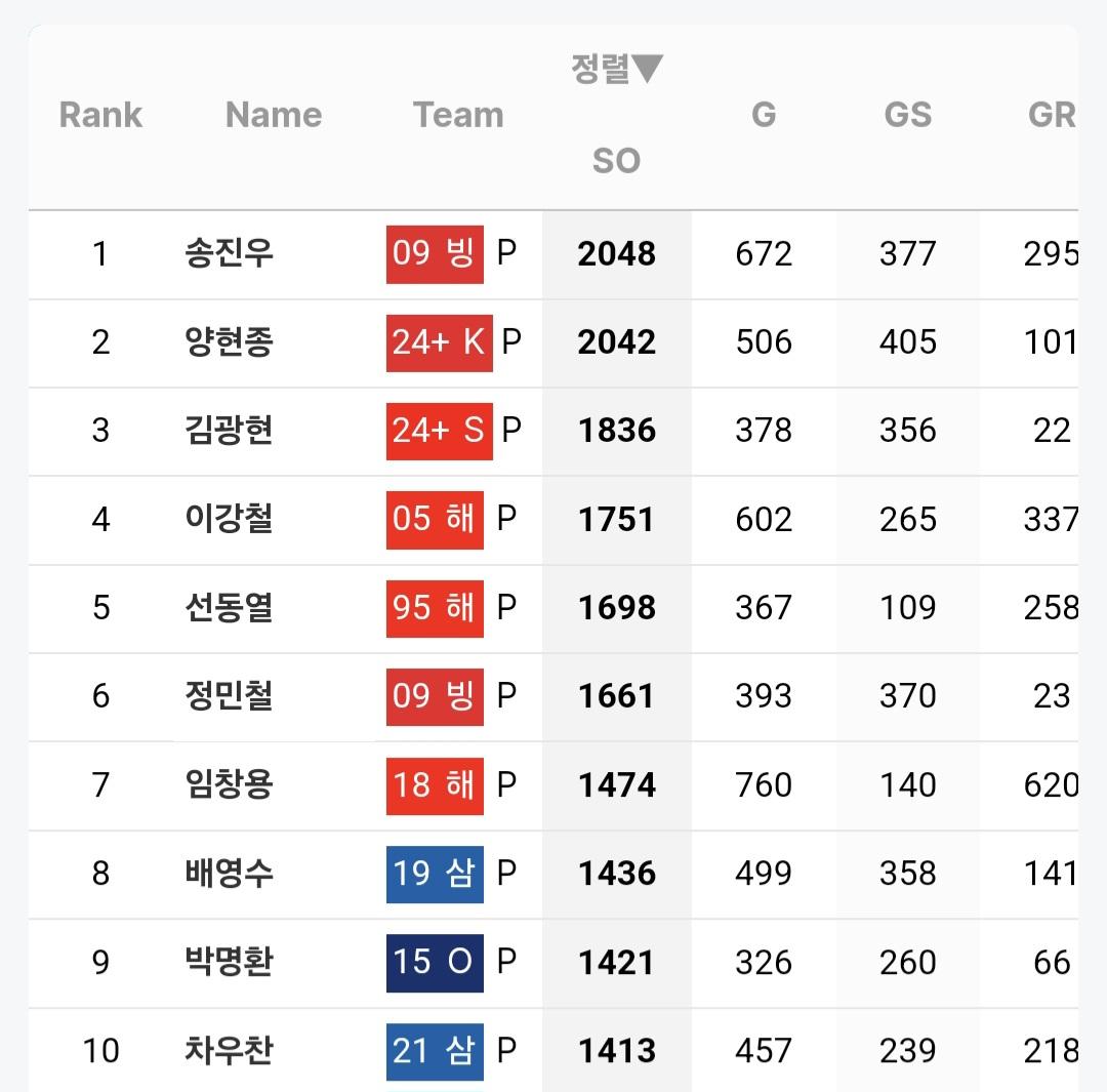 이 시간 현재의 자료를 보면 송진우가 2048개이고 양현종이 2042개군요.