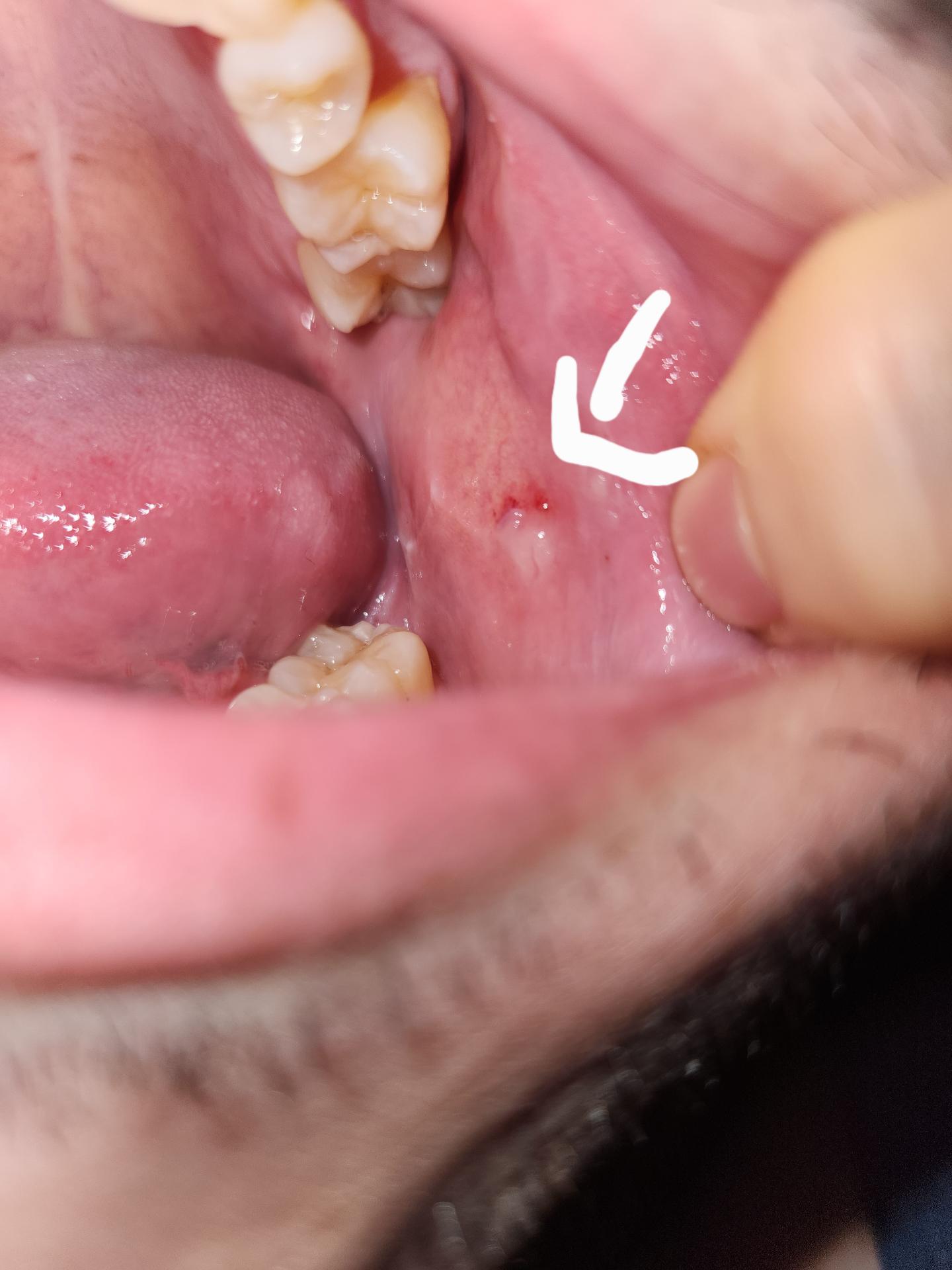 사진에 보이는건 볼살이 치아에 씹혀서 생긴 상처 입니다. 큰 문제가 잇는건 아니니 걱정하지마세요.