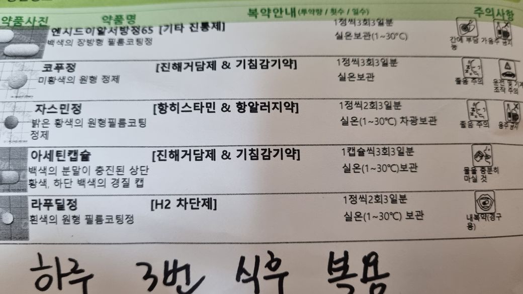 증상이 심하시다면 둘 중 한가지는 아래 약들과 병용하여 복용 가능합니다. 두 가지를 모두 드시지는 마시고 둘 중 한가지만 드시면 됩니다. 처방받은 약과 함께 하루에 3번 식후 한알 복용하시면 됩니다.