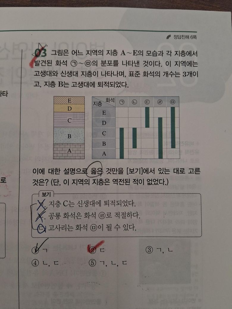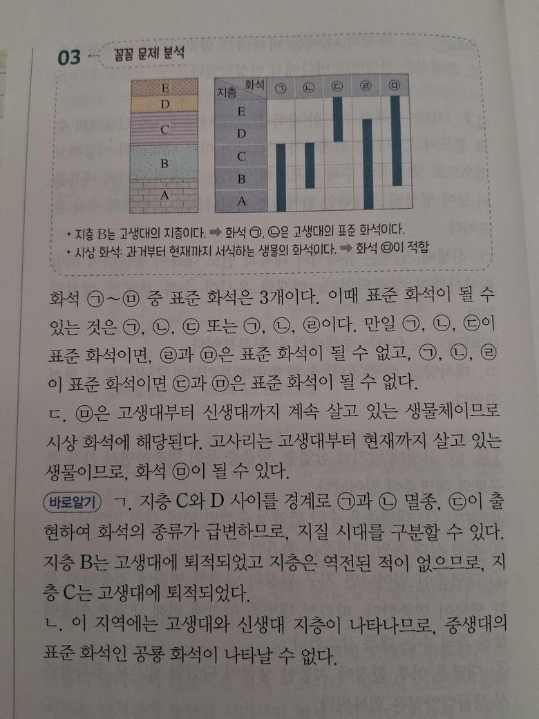 Q2. '문제에서 고생대와 신생대 지층이 나타나며'라고 했으니, 지층 C와 D 사이를 경계로 밑쪽은 고생대, 위쪽은 신생대로 보는 것이 맞나요?