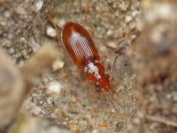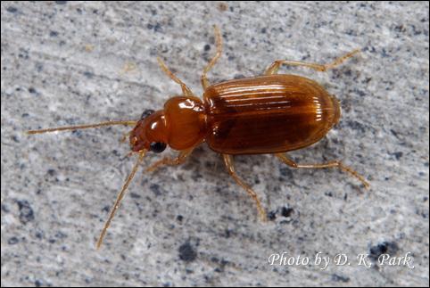 딱정벌레목 먼지벌레과에 속하는 작은 곤충으로 이름은 꼬마노랑먼지벌레로 몸길이는 약 3.5mm이며 딱지부분이 진한 갈색을 띄는게 특징입니다.