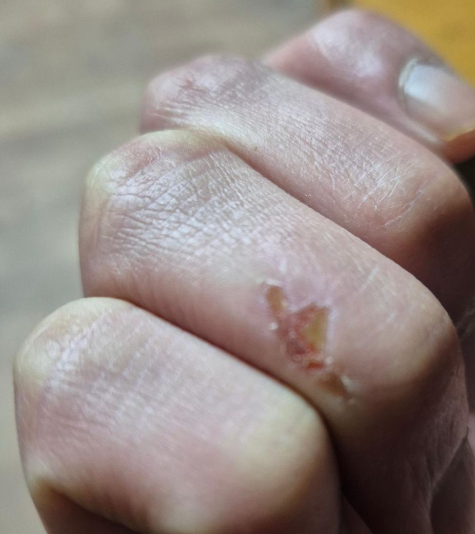 노란색 부분은 상처가 치유되면서 생길 수 있는 가피(딱지)로 보이는데 사진으론 정확하게 파악할수 없으나 2도 화상일 가능성이 높습니다. 다만 화상의 정도를 정확히 판단하기 위해 병원 가보시는게 맞습니다. 실제로 2도여도 보통 치료는 병원에서 받습니다