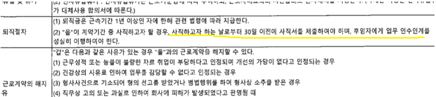 2.근로계약의 내내용에 따르면 1월 8일자 퇴사 시 12월 9일 이전에 사직서를 제출하여야 합니다.