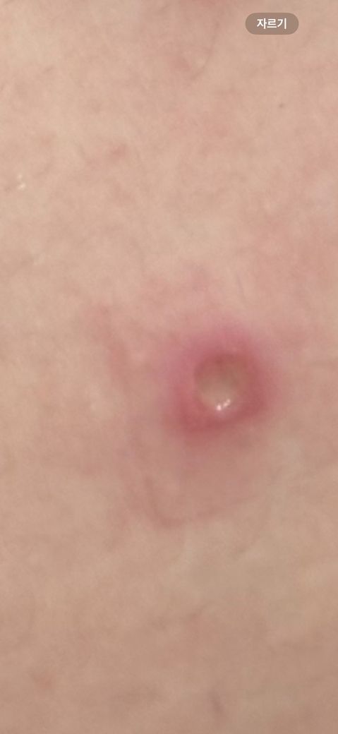 계속 갈아주다가 방금전에 사진을 찍었는데 어떤 상태인지를 모르겠어요. 동그랗게 파여있고 파인부분에 고름이 차있어요ㅠㅠ