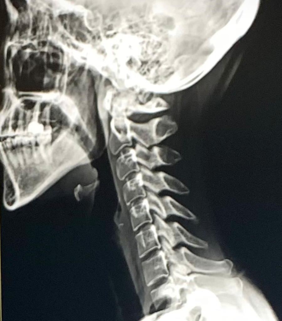 현재 엑스레이상 발견되는 뼈 부위는 설골(hyoid bone)입니다. 이전 해당 뼈는 정상적인 구조물로 수술과는 관계를 찾기는 어렵겠습니다.