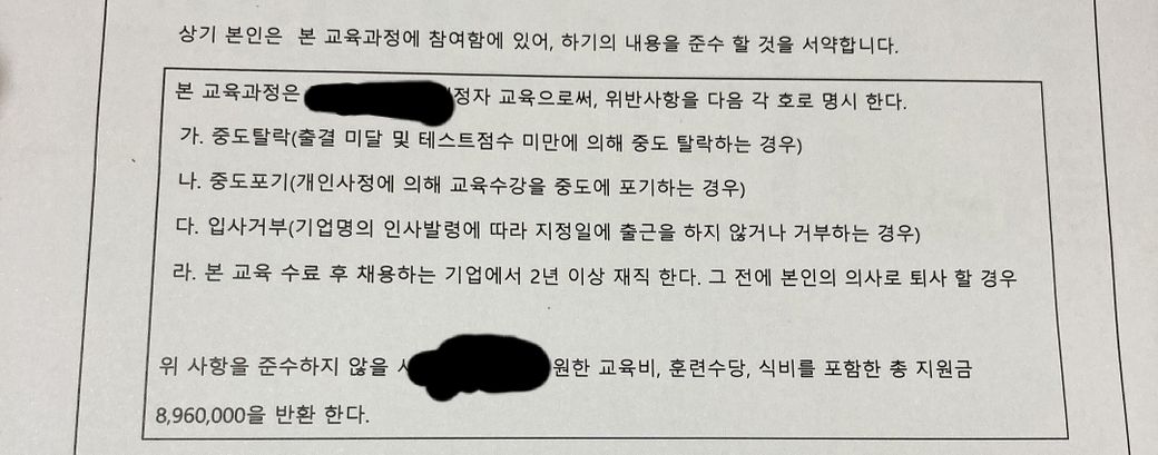 기존에 공지할때 수업에 대해서 교육비 관련 내용 전혀 포함안되어있었고, 면접 당시에도 2년 계약 이딴소리 하나도없었음.