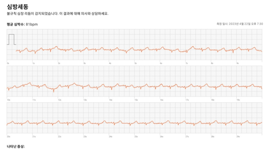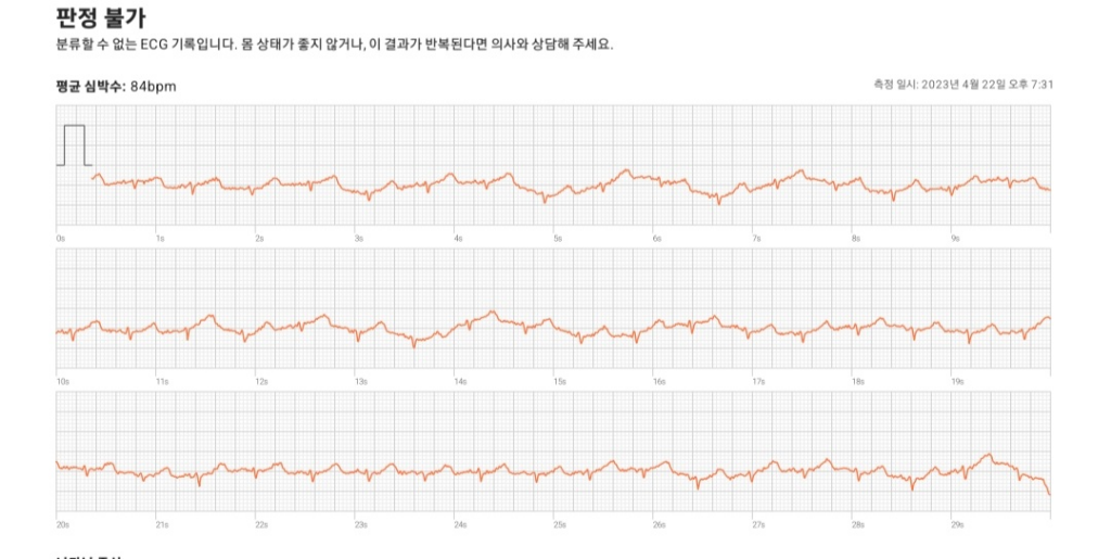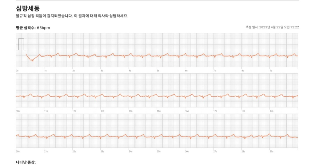 스마트 워치의 심전도 소견은 의학적 판단에 사용될 수 없기 때문에 올리신 사진만 가지고 어떻다 말씀드릴 수는 없습니다. 그렇지만 규칙적인 동성 리듬을 보이고 있으며 심박수만 다소 빠른 상태로 보입니다. 심장혈관내과적으로 더 정밀하게 검사를 받아보셔야 하겠지만 심장의 문제가 있을 가능성은 높아 보이지 않습니다.