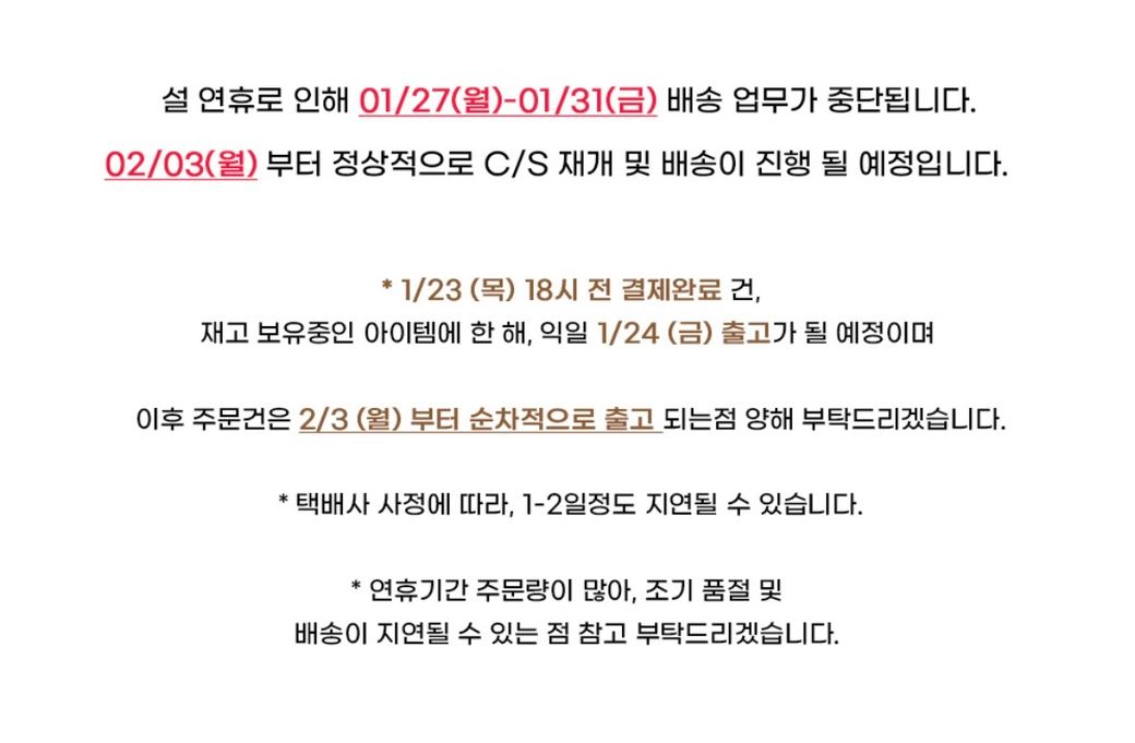 이러면 지금 결제하고 24일에 출고된다고 해도 연휴와 택배량 몰림 때문에 결국 2/3 쯤에 도착하겠죠?