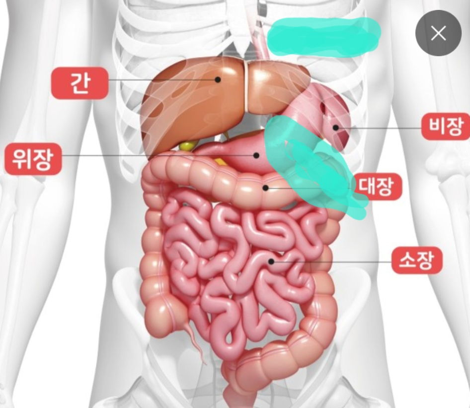 위치는 왼쪽가슴 바로 아래부터 왼쪽 갈비뼈 속, 갈비뼈 맨 아래쪽 까지 다양합니다.