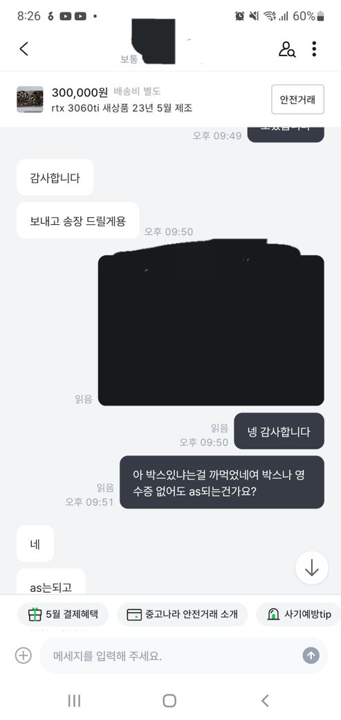 사연은 이렇습니다 중고거래로 3060ti 라는 그래픽카드를 사게되었습니다 제품명 as기간 그래픽 적출 글에 이런건 일절 언급이없었으며 다른 그래픽 카드를 판매시엔 제품명 또는 as 되는 기간 정보를 입력 해놓고 판매를 함 제가 구매한건 심플하게 그래픽 카드 넘버와 ti가 전부였습니다 그래픽 카드를