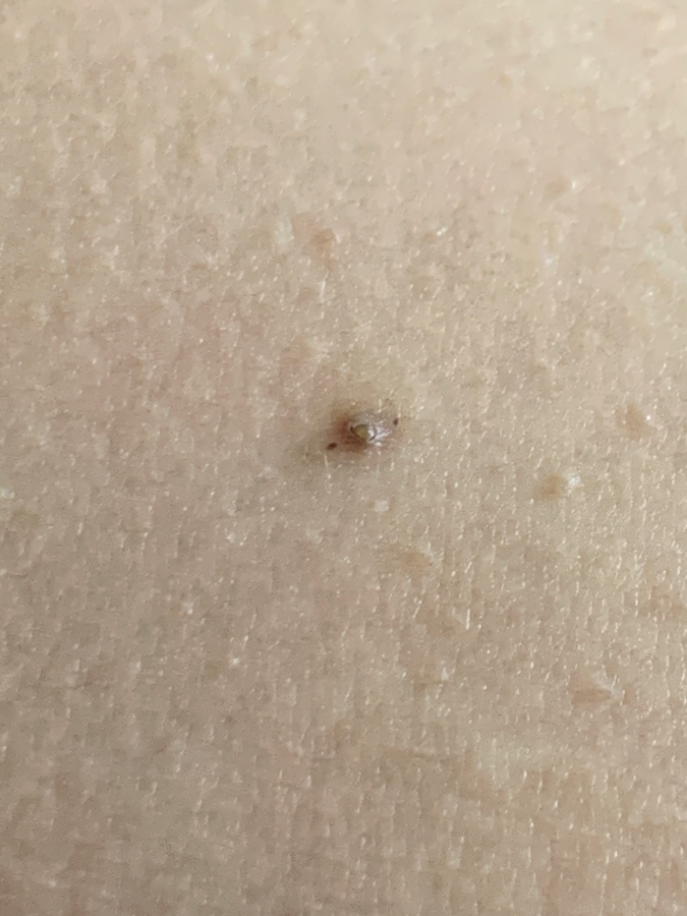 등쪽을 잘 안보다가 튀어나온게 있길래 사진 찍어봤는데 이상한 갈색 종기같은게 나서 여쭤보아요 ㅠㅠ