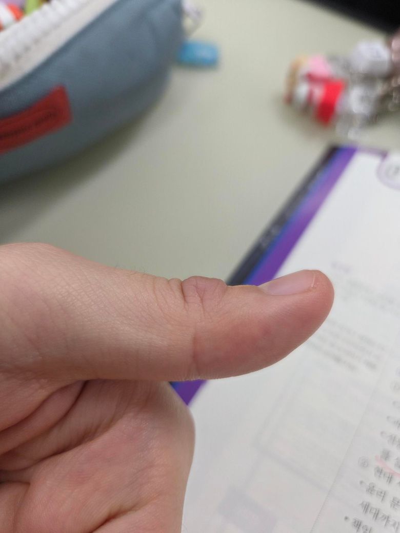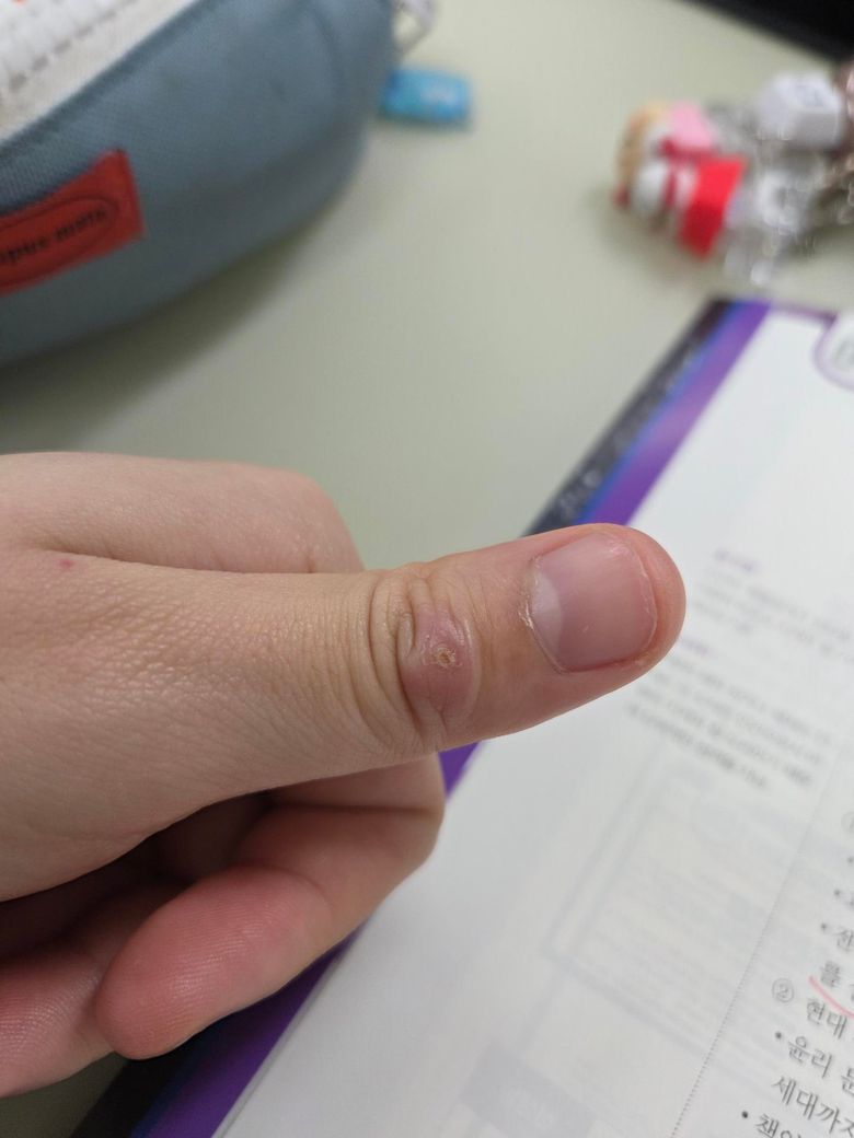 사진상으로는 절개 상처가 아물면서 딱지는 형성되었지만, 국소 부종과 약간의 융기(딱딱한 느낌)가 남아 있는 상태로 보입니다. 손가락을 움직일 때 불편한 점까지 고려하면 단순 치유 과정일 수도 있지만, 다음 두 가지를 구분하는 것이 중요합니다.