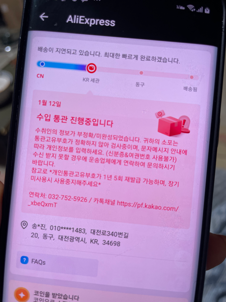 우리나라에 도착한 상황인것으로 추측되는데, 운송장 번호 등을 통해 운송업체, 통관업체를 확인하신 뒤 연락해보시면 좋을 것으로 보입니다.