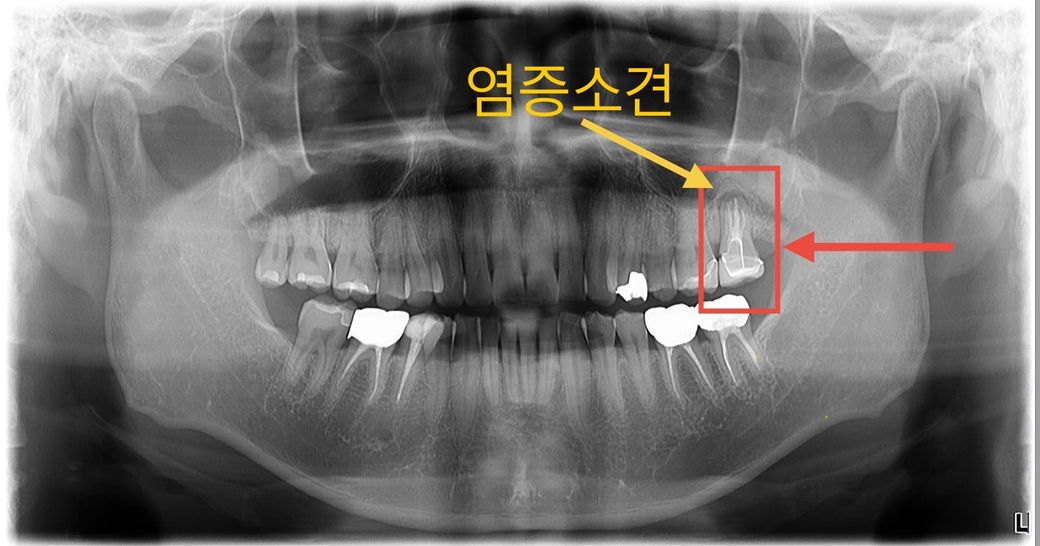 1) 엑스레이상 가장 안쪽 어금니쪽 잇몸에 염증이 보인다.
