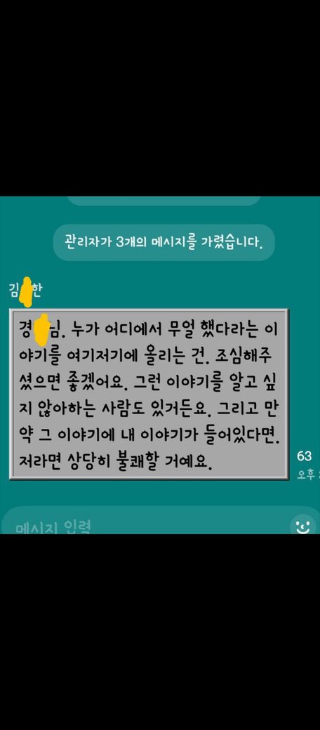 그러다가 사진과 같은 일이 생겼는데요. 회간난 그룹과 난x 내에 속한 히링스 그룹.. 제가 보낸 옵챗톡이 3개가 가려졌더라구요. 그러고 나서 김x한 님이 저를 지적 하더라구요.