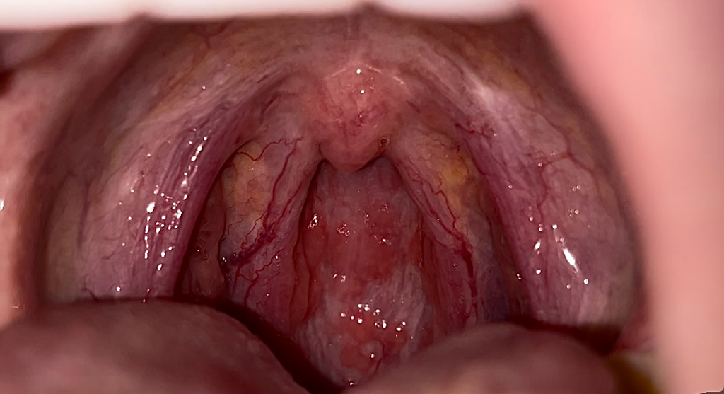 편도의 일부와 인두가 관찰되고 있으며 인두에 염증이 있습니다. 어떤 부위를 궁금해하시는 것인지 잘 모르겠고, 사진에는 성대가 보이지 않습니다. 성대는 내시경을 통해 확인할 수 있습니다.