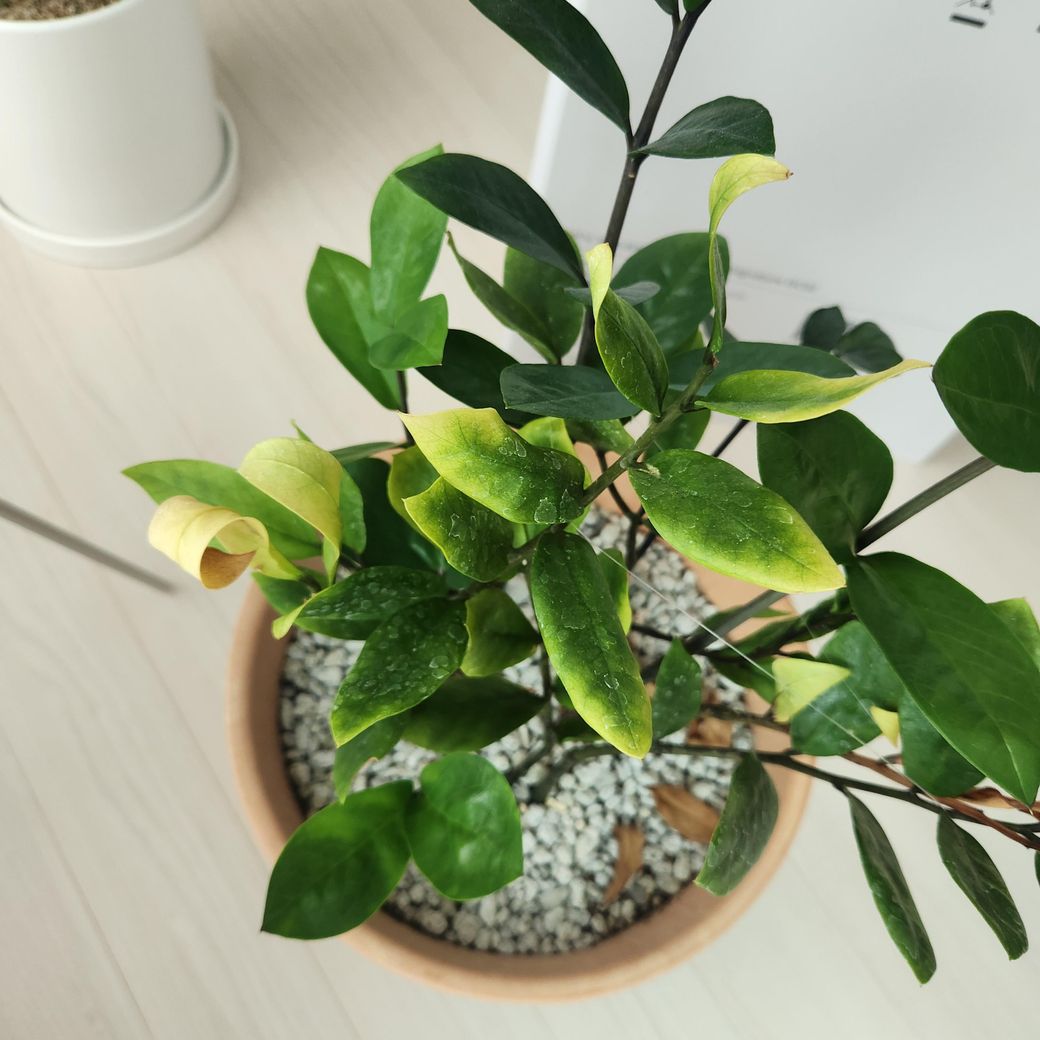 금전수 같은 경우 잎 끝과 일부 표면이 노랗게 변색이 됐네요
