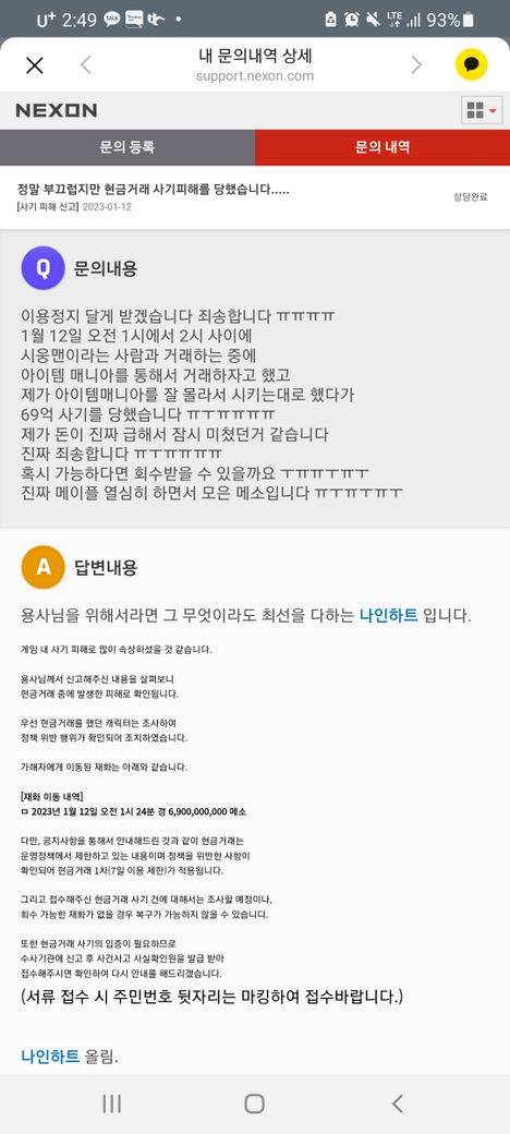 제가 사기꾼한테 메소를 건내줬지만 현금을 받지 못했습니다