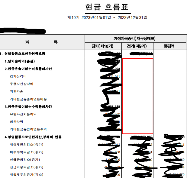 빨간 박스 부분은 빈칸입니다. 어느 연도의 현금 흐름표를 봐도 '전기'의 저 부분은 항상 비워져 있던데