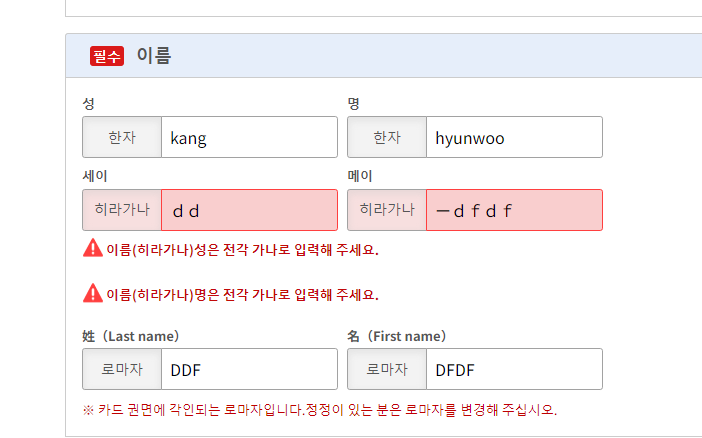 라쿠텐 카드를 하나 만들려고 하는데 성과 이름 적는란 세이에서 히라가나 이름하고 성을 적는 란이 있는데