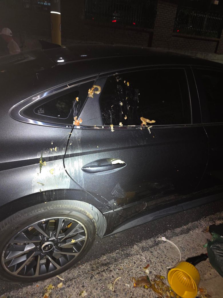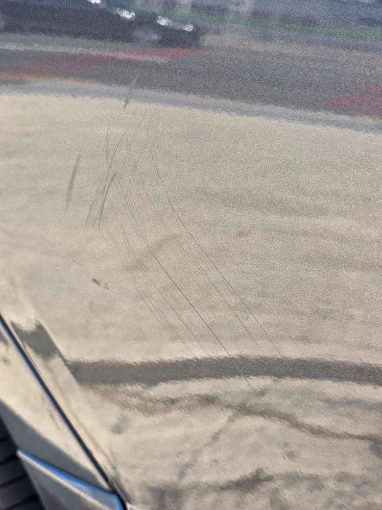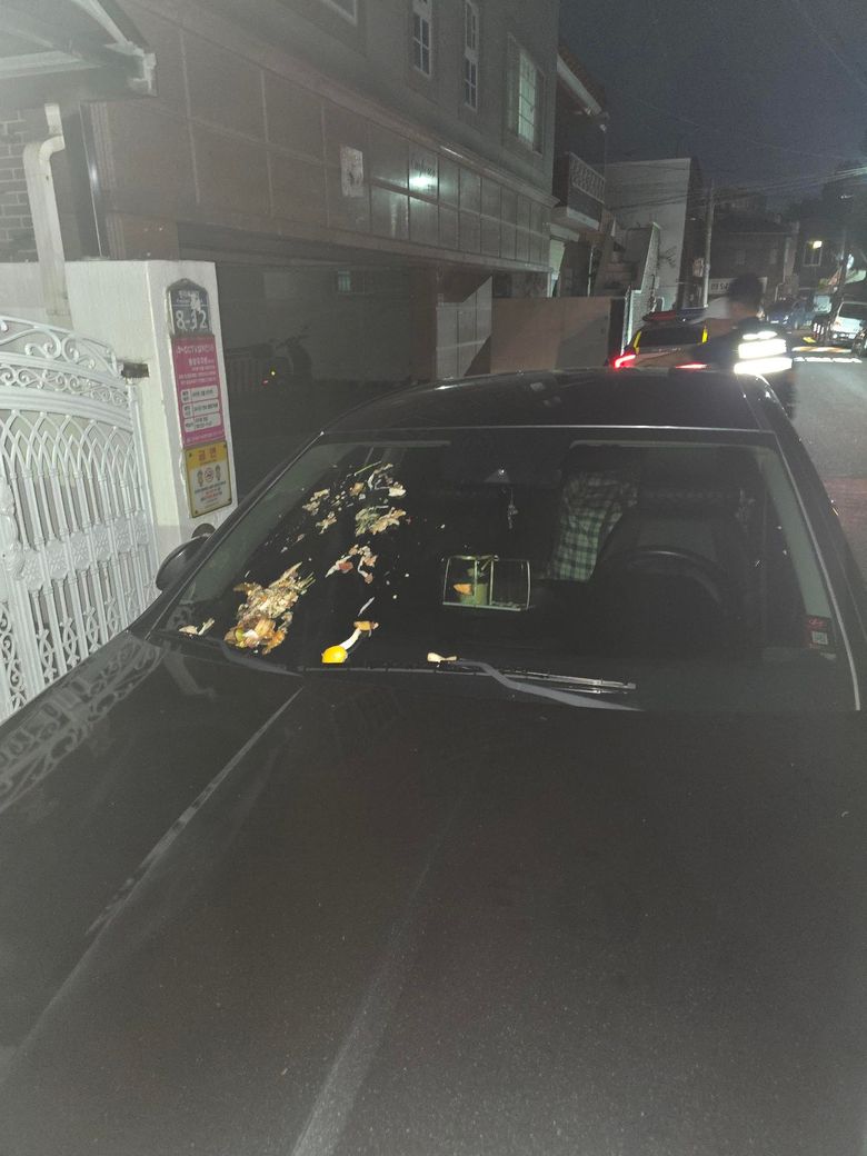 앞 유리창 및 조수석 후방 음식물 쓰레기 투기 및 차량 전체부위 스크레치 및 파손시켰습니다.