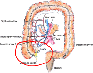 ileocolic area 라는 말은 회장과 대장을 합친 부분이라는 의미입니다. 위치로는 우측 아랫 부분이고