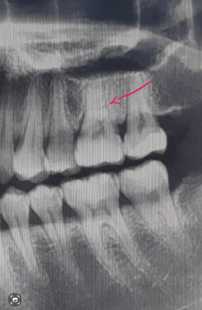 사진에서 가리키는 부분은 치아에 뿌리가 분지되는 부분입니다 크랙의 형태로는 보이지 않기 때문에 크게 걱정하지는 않으셔도 됩니다.
