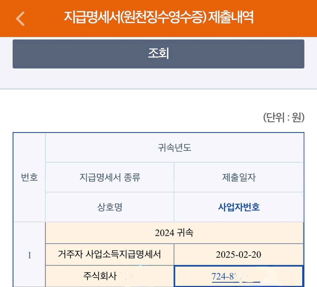 간이지급명세서와 첫번째 사진 속 원청징수영수증에는 상호명(법인명)이 주식회사 A라고 뜹니다.