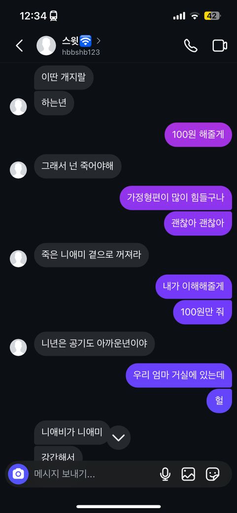 전 고등학교 재학중인 학생입니다. 며칠 전 제 지인에게 자신의 신원을 밝히지 않은 계정에서 제 지인을 향한 외모비하의 연락을 받았다는 사실을 듣고 제가 그 계정에 먼저 연락을 보냈습니다. 하지만 그 계정주는 저에게 욕설과 패드립, 저희 부모님을 향한 성적인 발언을 서슴치 않고 해댄 후 제 계정을 차단하고 도망을 갔습니다. 그리고 오늘, 제가 주변사람들에게서 얻은 정보를 가지고 50분동안 그분에게 보낼 마지막 메시지를 장문으로 써서 새 계정을 파서 인스타그램 스토리에 글을 올리며 서면사과를 해주시면 제가 선처를 해주겠다 하였지만 스토리를 읽은 후 즉시 저를 차단하고 본인의 계정을 폭파시켰습니다. 이러한 경우에도 처벌이 가능할까요?