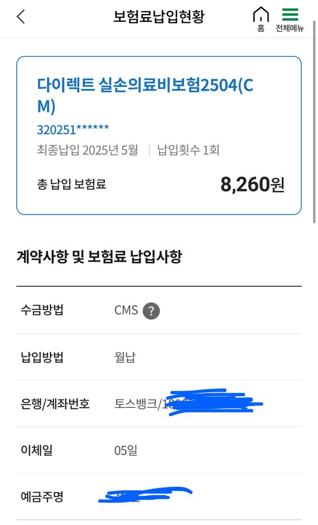 보험을 가입하면서 첫회보험료는 납입이 된것 같습니다 그리고 6월보험료는 5일날 자동이체 될것입니다 최종납입 5월 납입횟수 1회로 되어 있습니다 정상입니다