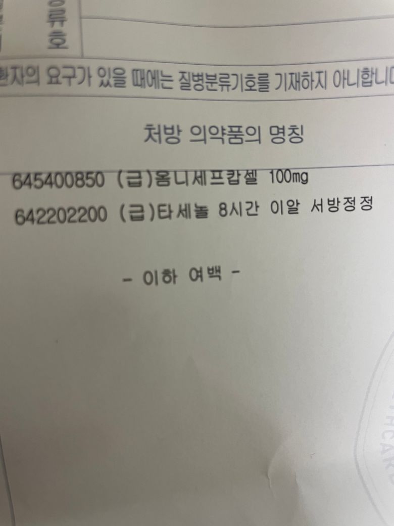 오늘 병원에서 처방받은 약들입니다. 하루 3회 일주일 처방받았습니다. (옴니세프캡슐 100mg, 타세놀 8시간 이알 서방정)