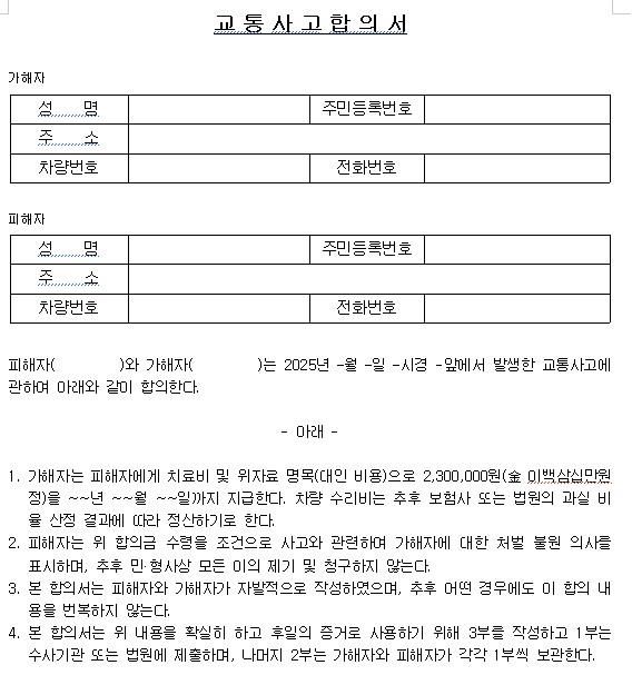 교통사고 합의서 내용 한 번만 부탁드립니다.