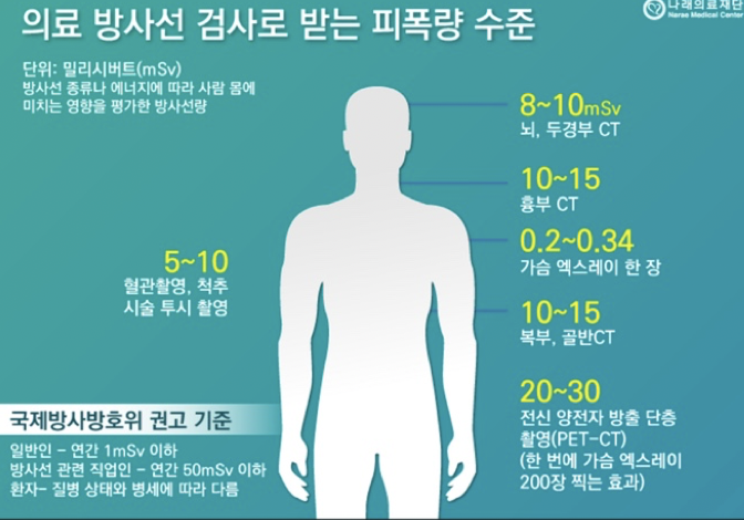 흉부 X-ray는 0.05mSv정도의 방사선에 노출됩니다. 흉부 CT는 10-15mSv정도의 방사선에 노출됩니다.
