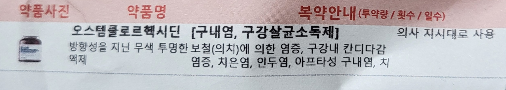 처방받은 약은 아침, 저녁으로 1분 가글하고 뱉으면되고 물로 헹구면 약도 씻겨내려가기때문에 10분정도는 물도 먹지마세요.