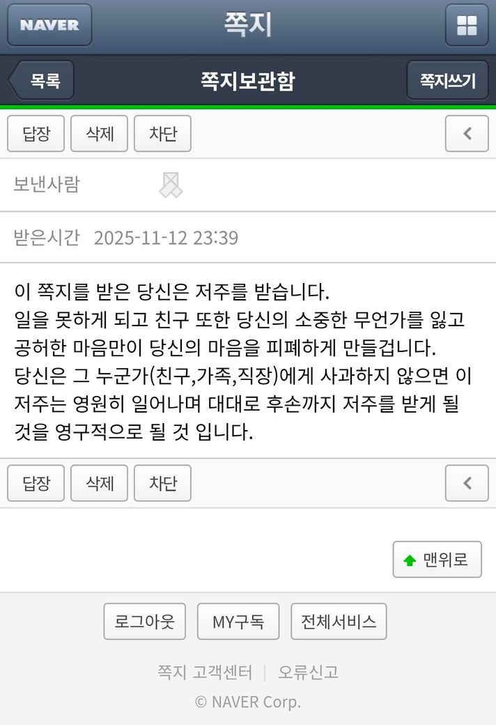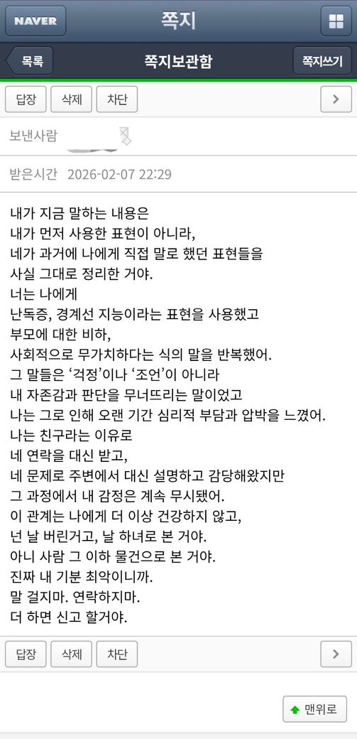 나르시시스트 친구와 손절한지 꽤 됬는데 지금도 여전히 네이버 쪽지로 폭언,협박성 내용을 보내는데 지속적 괴롭힘 인정되나요? 이정도인데 이런 내용으로 쪽지가 또 온다면 법적인 도움을 받아야할까요...?