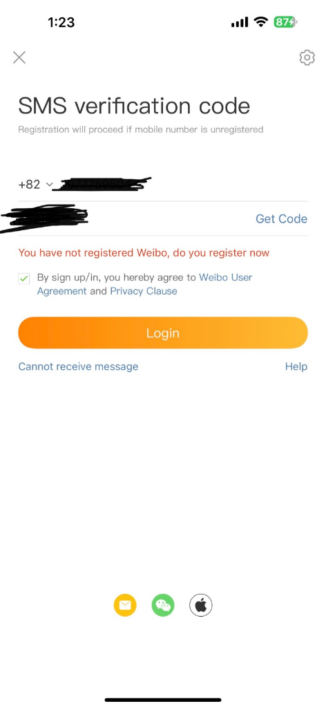 안녕하세요. 고결한아비109입니다. 문자 인증 받으라는건데요 그전에 웨이보 가입은 하셨나요? 가입부터 하셔야 가능하다고 하네요
