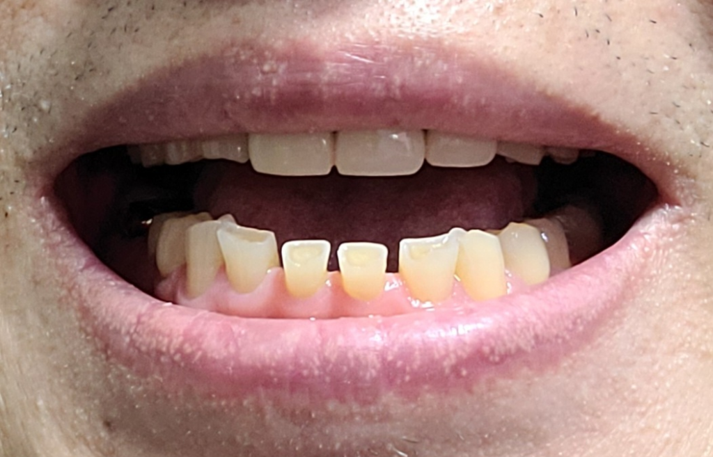 아랫니의 마모 상태가 심하기 때문에 치료를 한다면 크라운을 씌우는 치료가 필요해 보입니다.