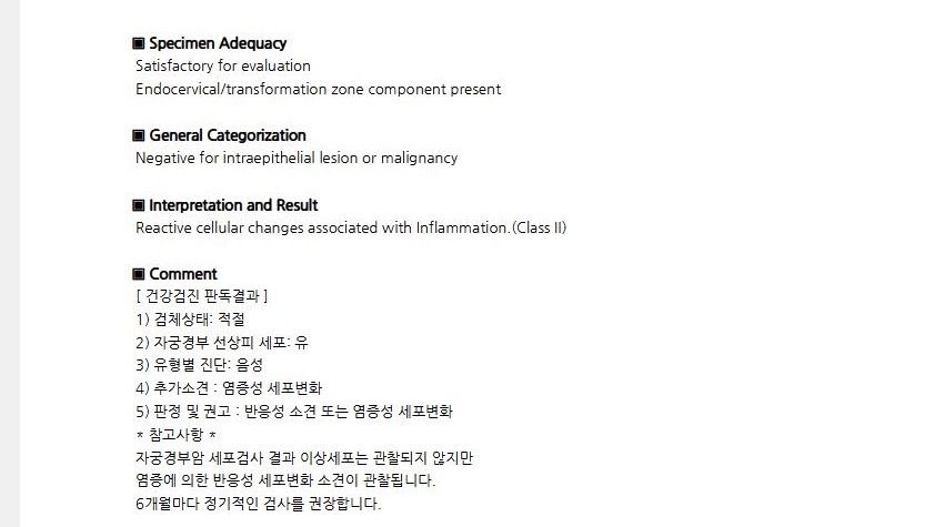 다만 “Reactive cellular changes associated with inflammation (Class II)”라는 문구가 있어 염증으로 인한 반응성 세포 변화가 보였다는 의미입니다. 이는 자궁경부나 질에 염증이 있을 때 흔히 나타나는 소견이며, 대부분 질염이나 경미한 자궁경부염에서 관찰됩니다. 암이나 전암 단계와는 별개의 소견입니다.