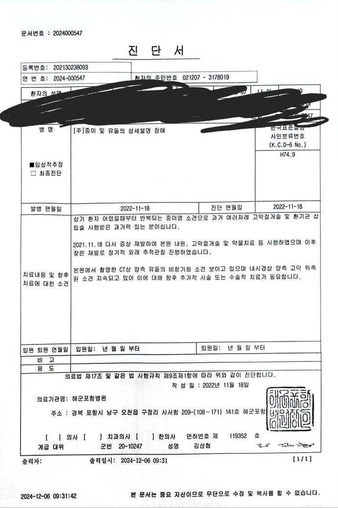 사진 및 튜브 넣어야한다는 병원 소견서 첨부 합니다