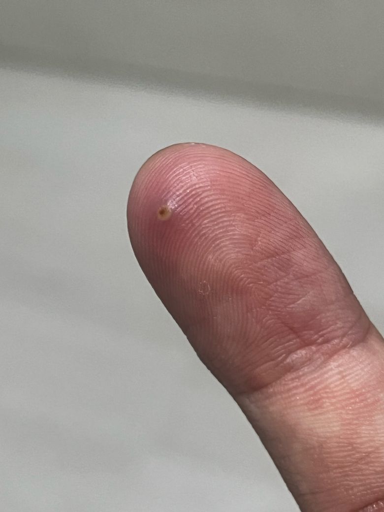 사진상으로는 사마귀 가능성도 배제할 수 없습니다. 특히 손가락 끝에 생기고 누를 때 통증이 있으며 중심부가 단단해 보이는 경우 초기 사마귀가 티눈처럼 보이기도 합니다. 초기에는 검은 점이 뚜렷하지 않을 수 있어 육안만으로 단정하기는 어렵습니다.