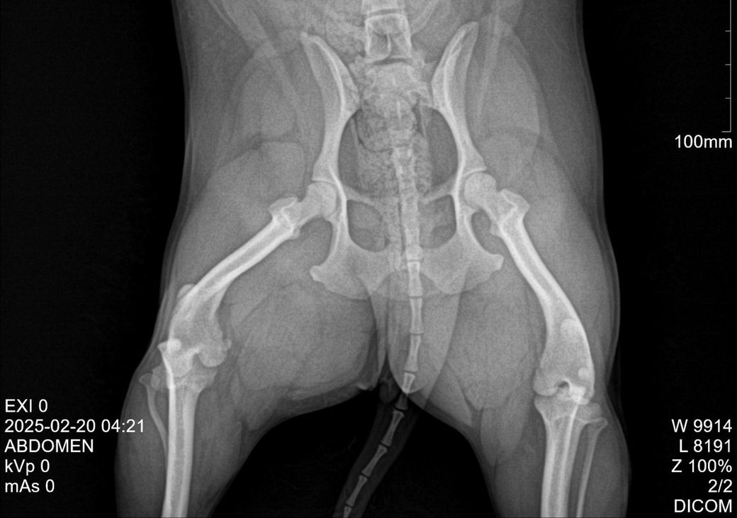 다리를 찍으려던건 아니고 다른 곳 보다가 보인건데 슬개골 탈구 의심됩니다 병원에서 2기라고는 했는데 그건 왼쪽이구요