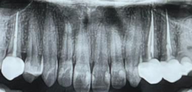 사진으로 봤을 경우에는 크게 문제가 없는것으로 보입니다. 하지만 사진의 화질이 좋지 않고 왼쪽의 뒤의 치아는 뿌리부분이 어두워 보이기 때문에 좀더 정확한 확인이 필요해 보입니다.