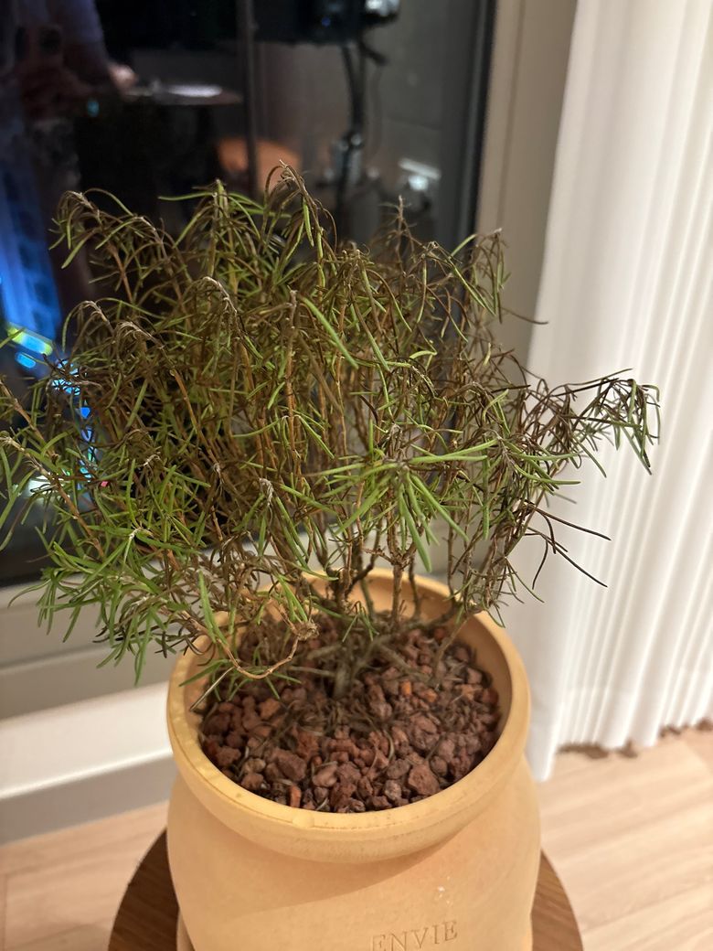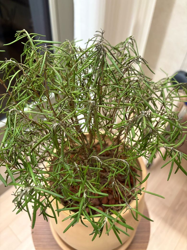 사진 속 로즈마리는 잎이 갈변하고 축 처진 모습으로 봐서 과습 또는 뿌리 손상이 의심됩니다. 최근 비와 습한 날씨에 물 주는 주기를 늘리렸다고 하셨는데 로즈마리는 건조한 환경을 좋아하는 허브라 과습에 특히 민감합니다. 줄기를 눌렀을 때 유연하고 속이 초록빛이면 회복 가능성이 있습니다. 하지만 가지 대부분이 바삭하고 속이 갈색이면 회복이 어려울수 있습니다