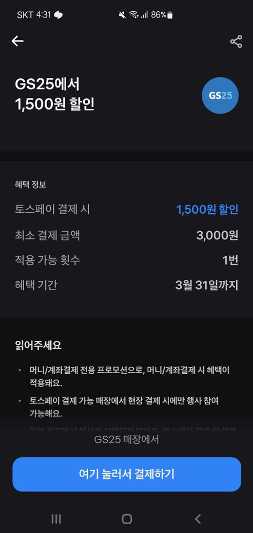 gs25에서 3천원 결제시 1500원 할인쿠폰을 쓰려고 하는데 토스포인트로 전액결제를 해도 할인 받을수 있는지 궁금합니다.